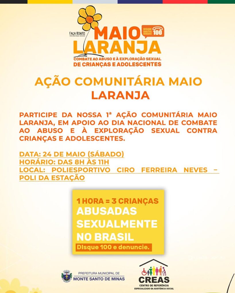 A população de Monte Santo de Minas está convidada a participar da 1ª Ação Comunitária Maio Laranja, marcada para o próximo sábado, 24 de maio, das 8h às 11h, no Poliesportivo Ciro Ferreira Neves, conhecido como Poli da Estação. O evento é uma mobilização em apoio ao Dia Nacional de Combate ao Abuso e à Exploração Sexual contra Crianças e Adolescentes.