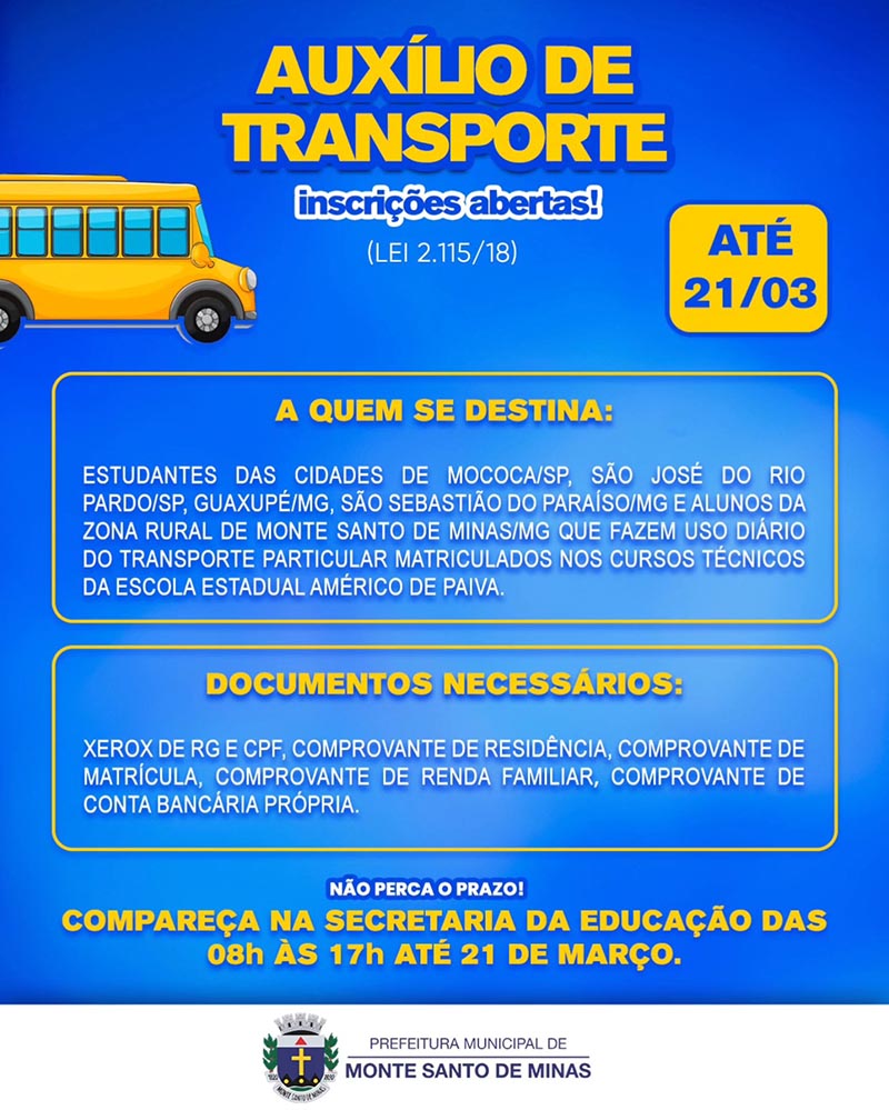 A Prefeitura de Monte Santo de Minas informa que estão abertas as inscrições para o Auxílio de Transporte Estudantil, em conformidade com a Lei 2.115/18. O benefício é destinado a estudantes de Mococa/SP, São José do Rio Pardo/SP, Guaxupé/MG, São Sebastião do Paraíso/MG, e alunos da zona rural de Monte Santo de Minas/MG que utilizam transporte particular para os cursos técnicos da Escola Estadual Américo de Paiva. As inscrições seguem até 21 de março de 2025.
