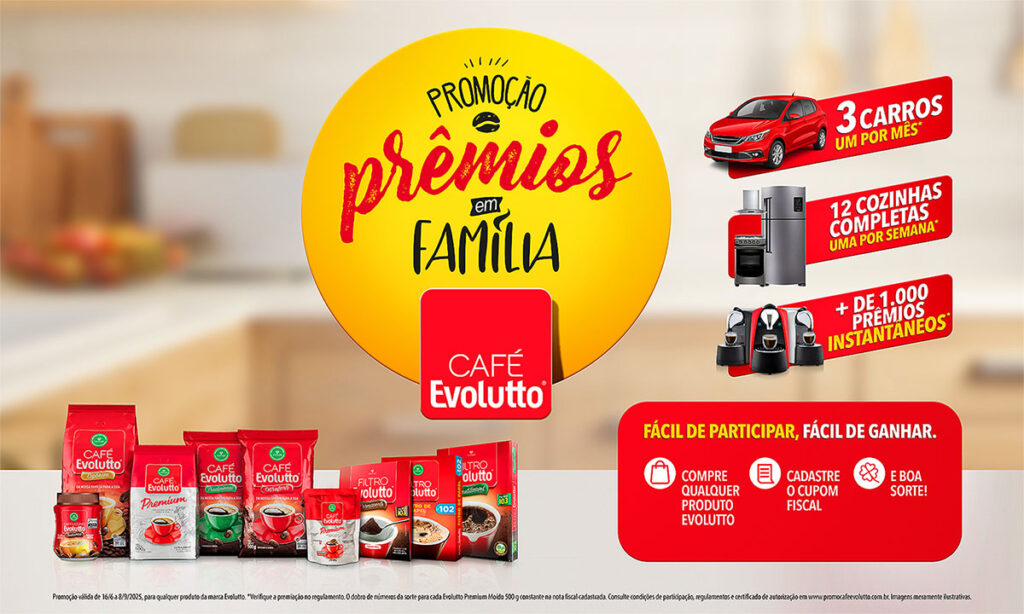 O Café Evolutto acaba de lançar a promoção “Prêmios em Família”. A marca da Torrefação Cooxupé segue a mecânica “compre, cadastre e concorra”, na qual os consumidores precisam comprar os produtos, fazer um cadastro no site promocafeevolutto.com.br e concorrer a mais de mil prêmios instantâneos, 12 cozinhas completas e 3 carros Fiat Argo 0km. A campanha será realizada de 16 de junho até 8 de setembro.
