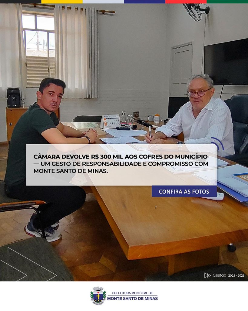 Em um gesto de responsabilidade e gestão eficiente dos recursos públicos, a Câmara Municipal de Monte Santo de Minas devolveu R$ 300 mil aos cofres do Município nesta quarta-feira (5).