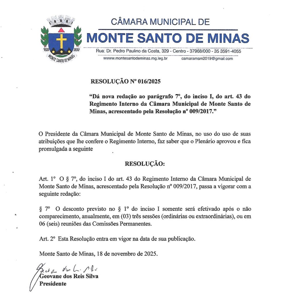 📘 Resolução 016/2025 redefine regras de presença no Legislativo Nova redação altera critérios para efetivação de desconto por faltas A Câmara Municipal de Monte Santo de Minas publicou a Resolução nº 016/2025, que modifica o parágrafo 7º do inciso I do Art. 43 do Regimento Interno. A nova redação estabelece que o desconto previsto só será aplicado após o não comparecimento anual a três sessões — ordinárias ou extraordinárias — ou a seis reuniões das Comissões Permanentes. A medida entra em vigor na data da publicação e reforça critérios de presença e compromisso parlamentar. #CamaraMunicipal #MonteSantodeMinas #Resolucao2025 #Legislativo #RegimentoInterno #ComissoesPermanentes #SessõesPlenárias #TransparenciaPublica #GestaoPublica #PoderLegislativo