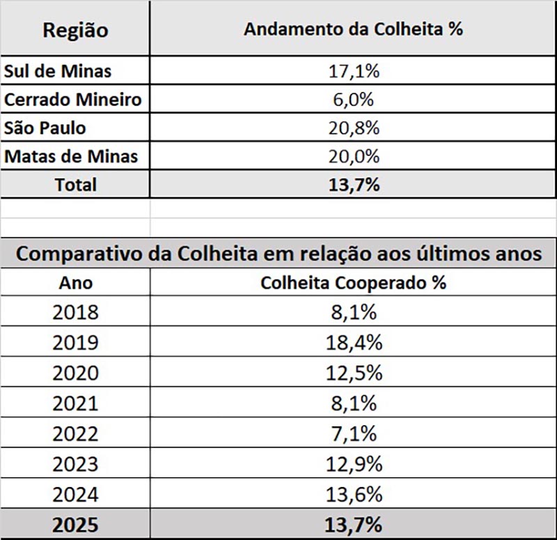 Até o dia 6 de junho, a colheita de café dos cooperados da Cooxupé alcançou 13,7% na área de atuação da cooperativa mineira, que compreende mais de 360 municípios.