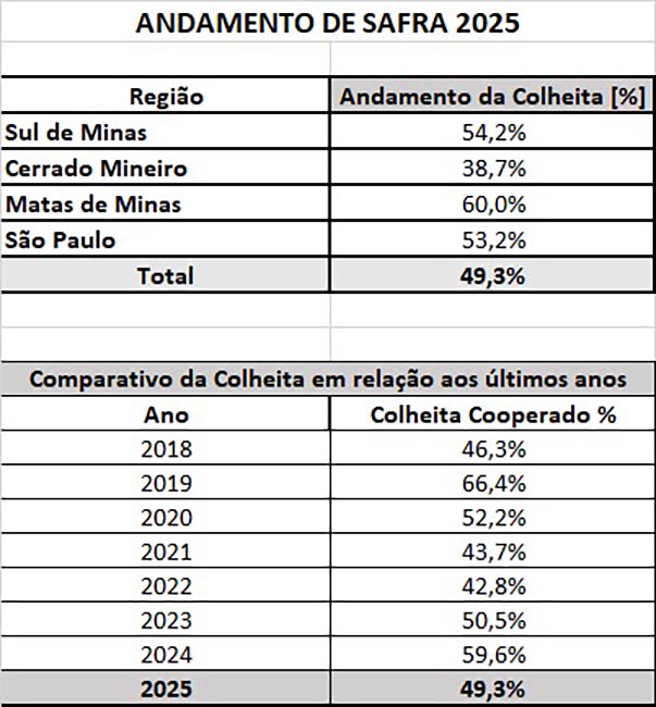 Até o dia 11 de julho, os cooperados colheram 49,3% do volume esperado neste ano. A cooperativa conta com mais de 20 mil produtores associados.