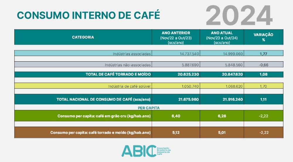 No total, foram consumidas 21,9 milhões de sacas frente aos 21,6 milhões em 2023. Contudo, o país segue como o segundo maior consumidor de café do mundo, atrás apenas dos Estados Unidos, que consomem anualmente 26 milhões de sacas. Entretanto, se compararmos o consumo per capita do Brasil com EUA (4,9 kg.hab.ano – café cru), o valor brasileiro é superior.