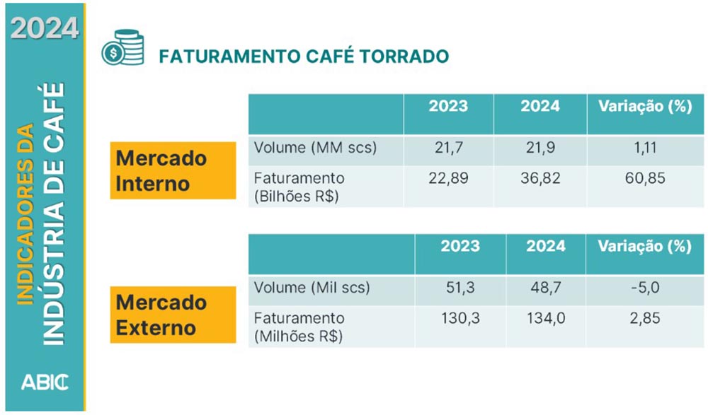 Nesse sentido, o faturamento da indústria de café torrado, em 2024, alcançou R$ 36,82 bilhões, uma variação percentual positiva de 60,85 quando comparado a 2023. Sobretudo, a alteração ocorre devido ao aumento do preço do café na gôndola.