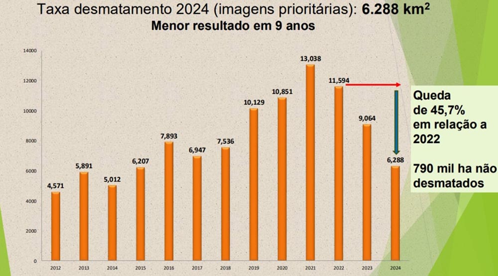 Já na Amazônia, a queda foi de 5% entre agosto de 2024 e abril de 2025 em relação ao mesmo período entre 2023 e 2024. Trata-se do melhor resultado desde 2016. Quanto ao primeiro quadrimestre de 2025, a redução foi de 1% em relação ao período de janeiro a abril do ano anterior.