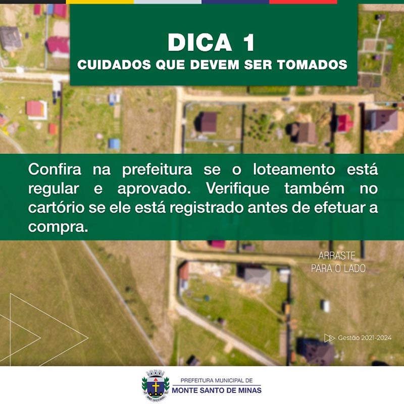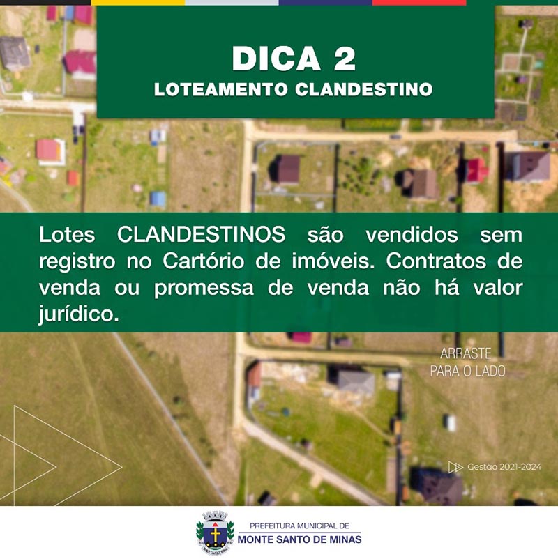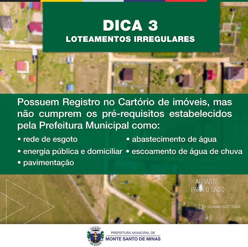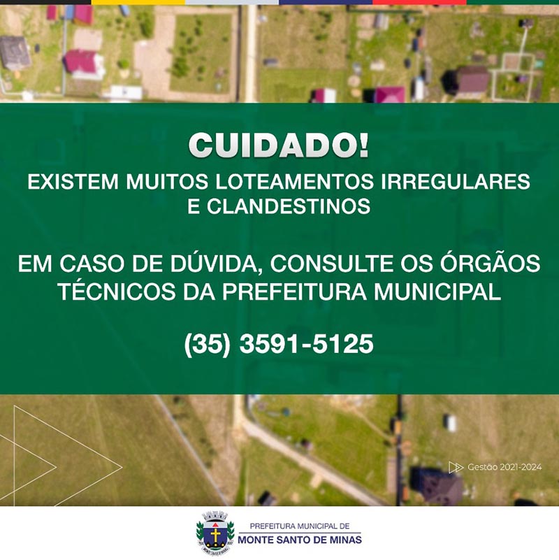 A Prefeitura de Monte Santo de Minas alerta os moradores sobre os riscos de comprar imóveis em loteamentos irregulares e clandestinos. Antes de efetuar a compra, é fundamental verificar a situação do loteamento junto à prefeitura e ao cartório de imóveis, para garantir a segurança jurídica da transação.