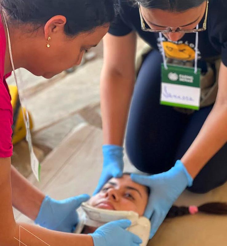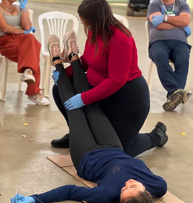 Durante a capacitação, os participantes aprenderam sobre normas regulamentadoras, classes de incêndios, manuseio de extintores, protocolos de primeiros socorros (como XABCDE e SAMPLER), além de ações práticas de prevenção e resposta a emergências.