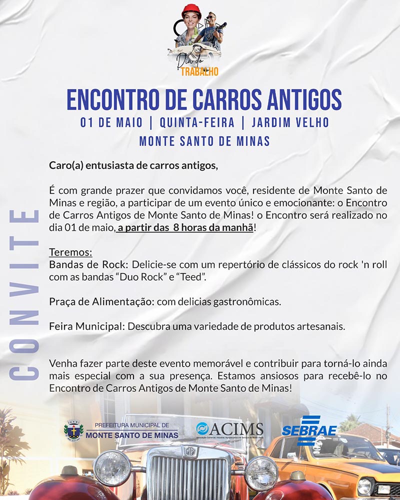 Monte Santo de Minas será palco de um evento imperdível para os apaixonados por veículos clássicos: o Encontro de Carros Antigos acontece no dia 1º de maio, a partir das 8h da manhã, reunindo moradores da cidade e da região em uma celebração cheia de estilo, tradição e cultura automotiva.