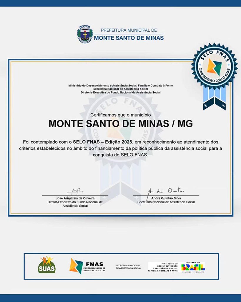 Monte Santo de Minas alcançou um patamar de destaque na gestão pública nacional ao conquistar o Selo FNAS – Edição 2025.