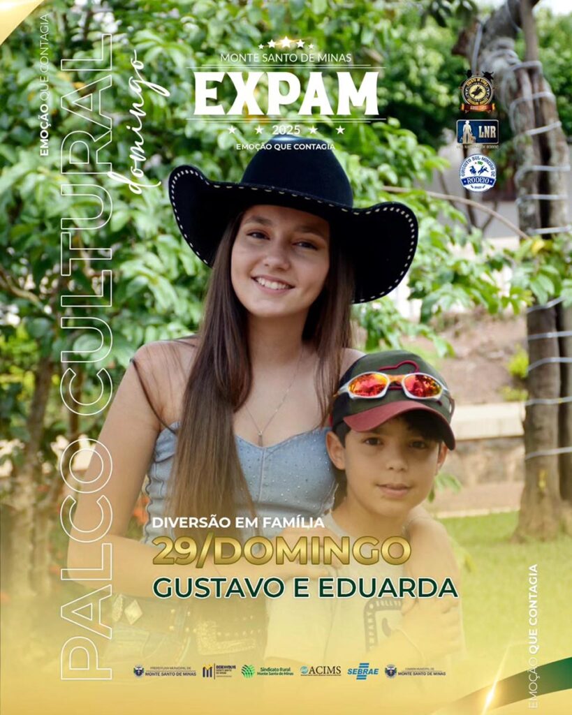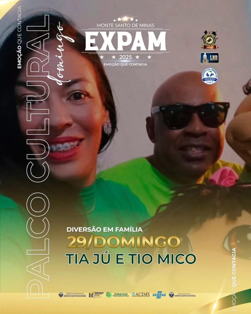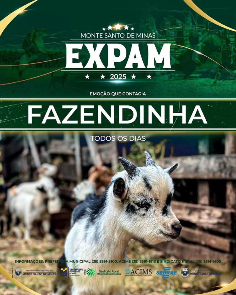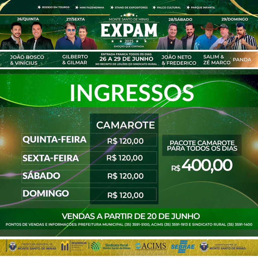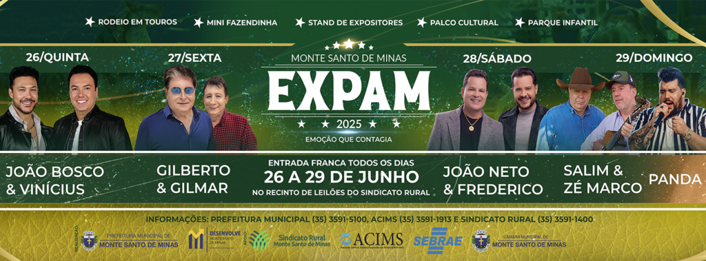 A tradicional EXPAM 2025 acontecerá entre os dias 26 e 29 de junho em Monte Santo de Minas. A festa trará grandes nomes da música como João Bosco & Vinícius, Gilberto & Gilmar, João Neto & Frederico, Salim & Zé Marco, além de atrações locais no Palco Cultural After. O camarote terá vista privilegiada, bar exclusivo, banheiros privativos e churrasco americano. Os ingressos custam R\$ 120 por dia ou R\$ 400 o pacote para os quatro dias.