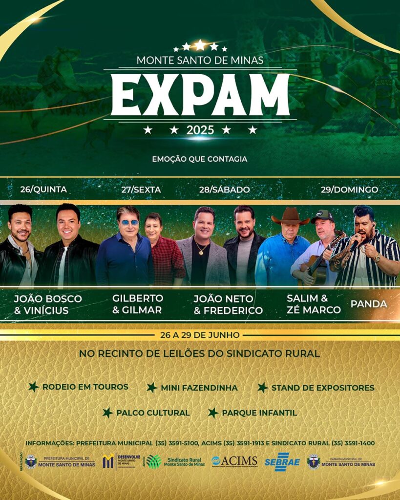 “A EXPAM é um evento que celebra a nossa cultura, a força do nosso agronegócio e proporciona entretenimento de qualidade para a população de Monte Santo de Minas e visitantes de toda a região. Além disso, a festa impulsiona o desenvolvimento econômico municipal, fortalece o turismo e movimenta intensamente o comércio local, gerando oportunidades e renda. Estamos trabalhando para que a edição de 2025 seja inesquecível, com muita segurança, organização e, claro, a emoção que contagia”, afirma Rodrigo Saulo Ribeiro, Secretário de Governo e Presidente da Festa.