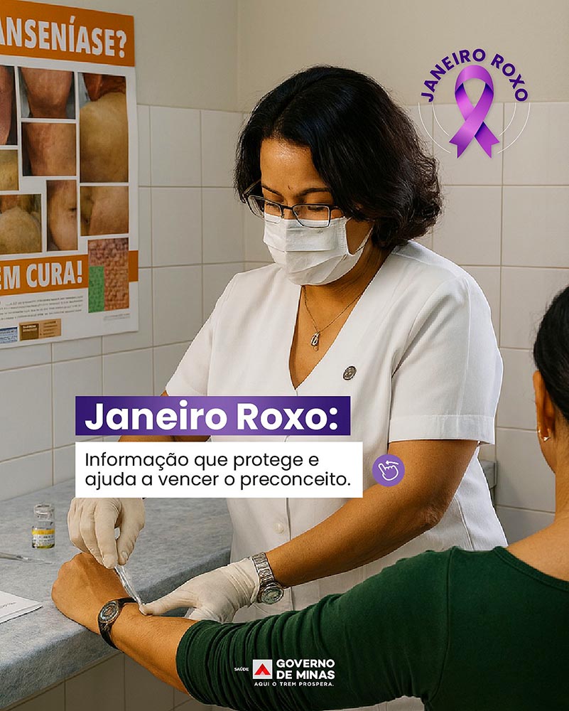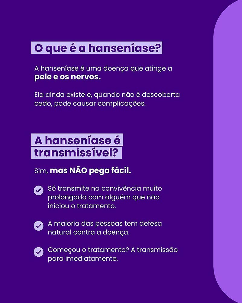 💜 Campanha estadual reforça a importância do diagnóstico precoce da hanseníase e destaca que o tratamento é gratuito e garante a cura
