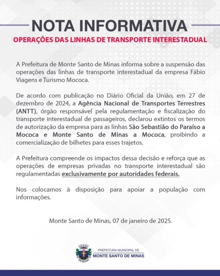 A Prefeitura de Monte Santo de Minas divulgou uma nota informativa sobre a suspensão das operações das linhas de transporte interestadual da empresa Fábio Viagens e Turismo Mococa. A medida foi determinada pela Agência Nacional de Transportes Terrestres (ANTT), órgão responsável pela regulamentação e fiscalização do transporte interestadual de passageiros.