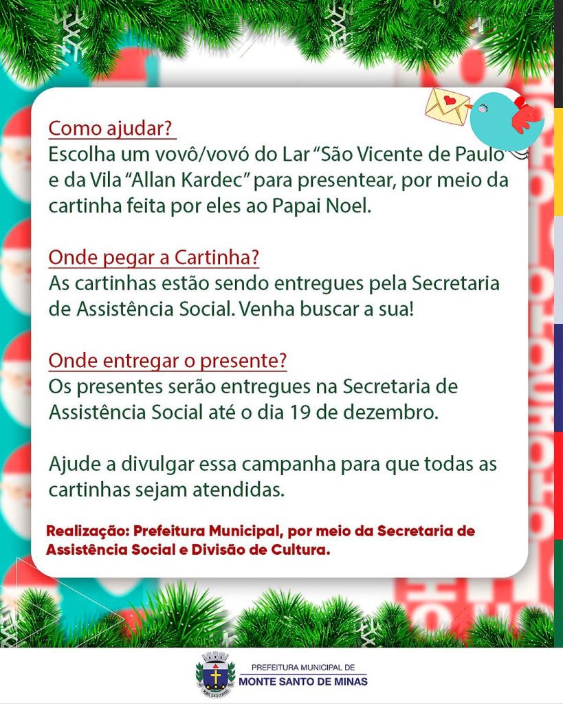O espírito natalino toma conta de Monte Santo de Minas com o lançamento da campanha “Natal de Amor – Adote uma Cartinha e Faça a Magia Acontecer”.
