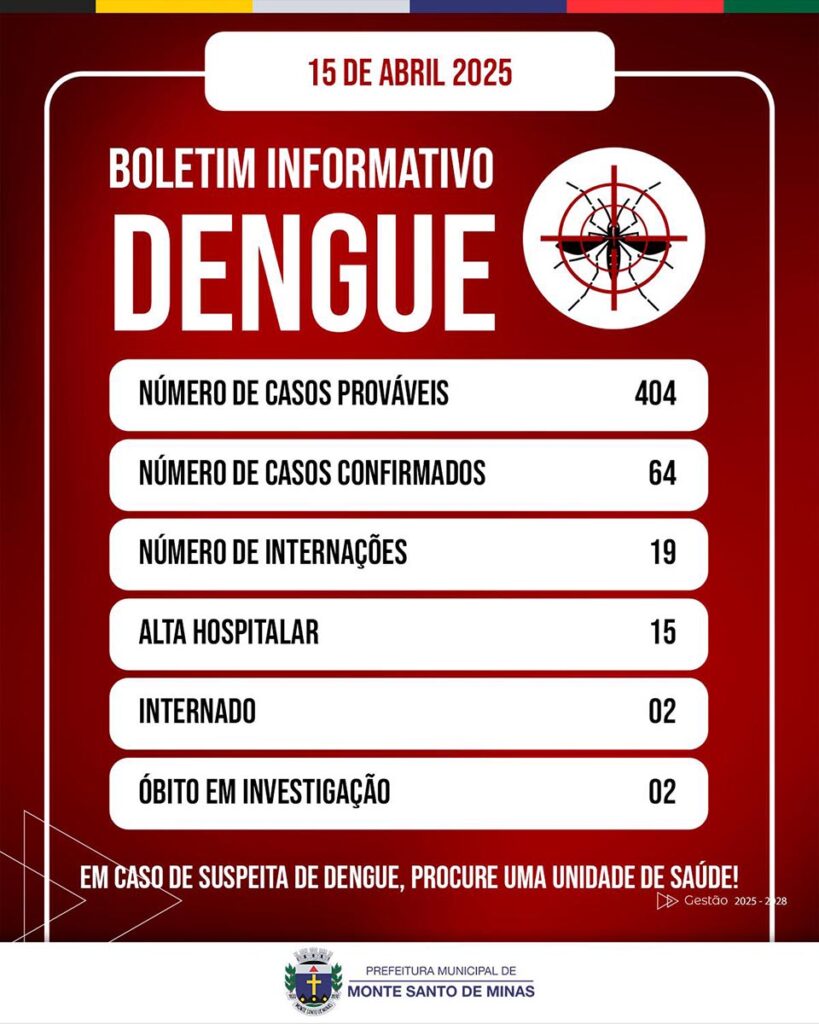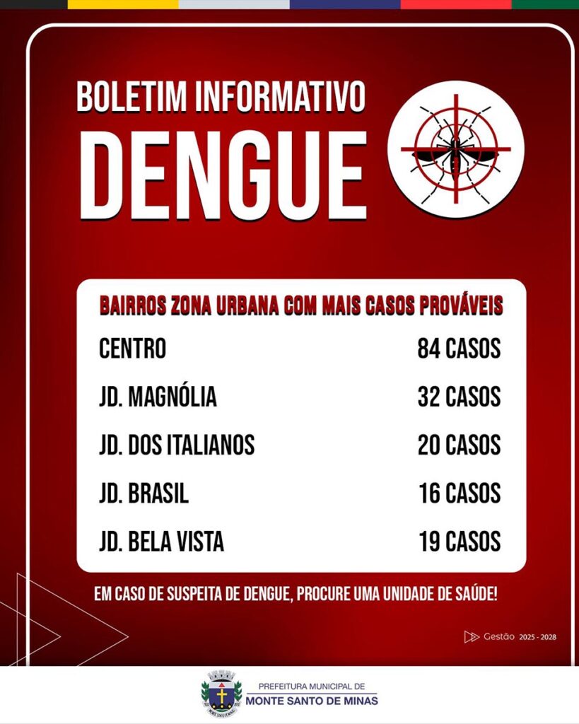 #Dengue #MonteSantoDeMinas #Saúde #CombateADengue #AedesAegypti #DoençaTropical #BoletimDengue #Prevenção #EmergênciaEmSaúde #VigilânciaSanitária