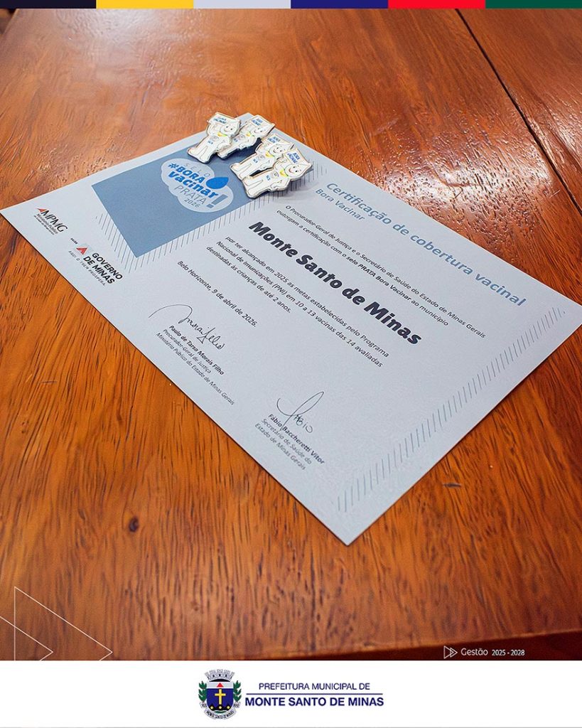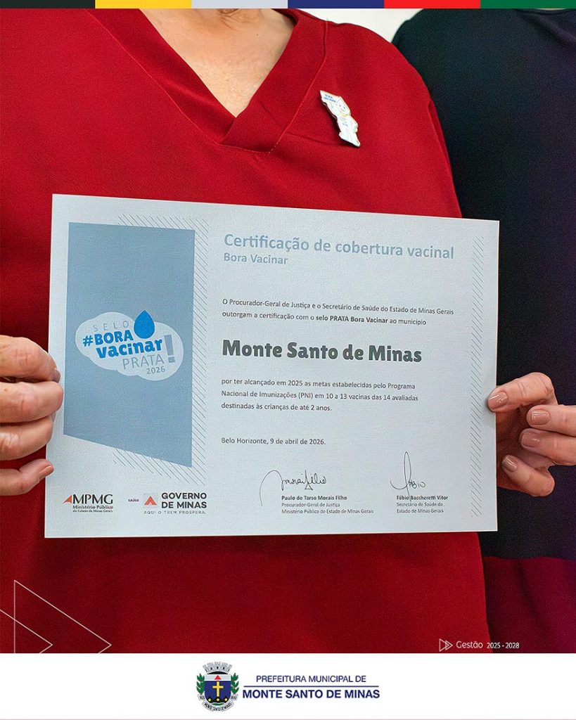 Monte Santo de Minas reafirmou sua posição de destaque na saúde pública mineira ao conquistar o Selo Prata do programa “Bora Vacinar”. O reconhecimento foi entregue oficialmente em Belo Horizonte, nesta quinta-feira, 9 de abril, durante o Conexão Minas-Saúde. A iniciativa, que é fruto de uma parceria entre o Ministério Público de Minas Gerais, a Secretaria de Estado de Saúde e o Cosems-MG, premia as cidades que demonstram excelência no cumprimento do calendário nacional de imunização.