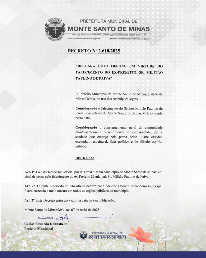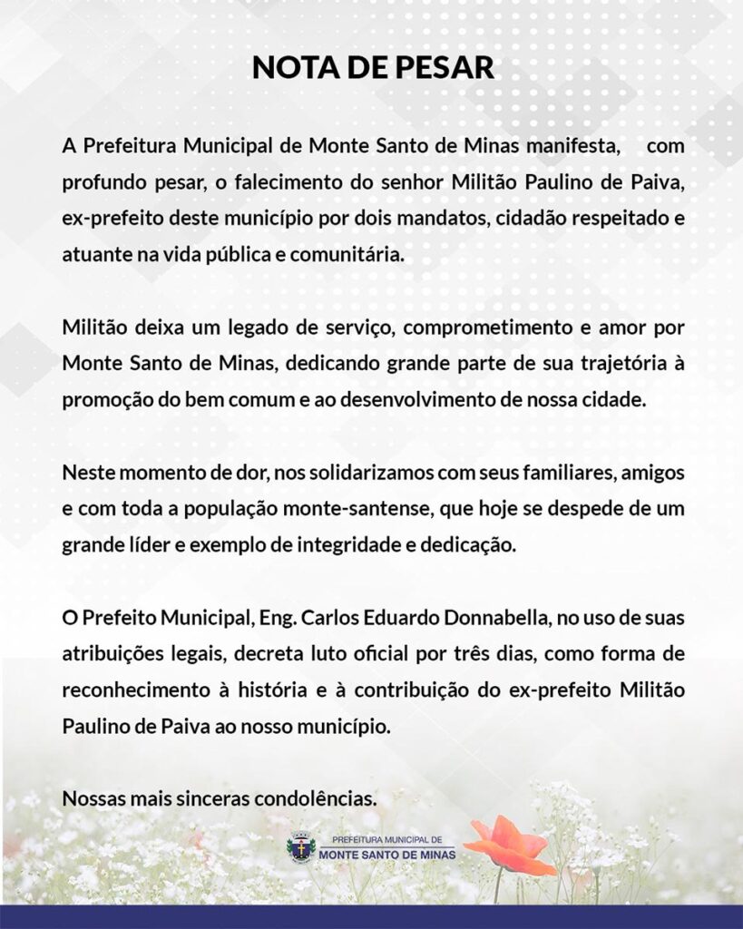 #MonteSantodeMinas #MilitãoPaulinoDePaiva #LutoOficial #LegadoPolítico #VidaPública #Homenagem #PolíticaMunicipal #DesenvolvimentoLocal #GestãoPública #JFPNoticias