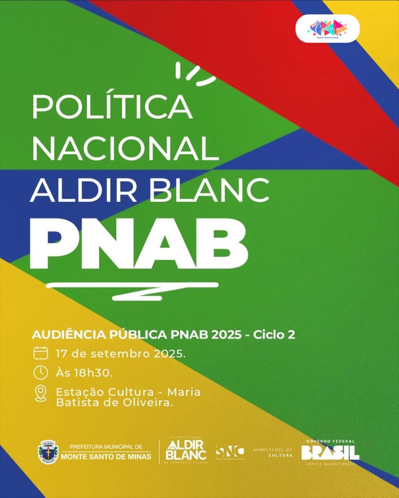 Monte Santo de Minas receberá no próximo dia 17 de setembro a Audiência Pública da Política Nacional Aldir Blanc (PNAB) 2025 – Ciclo 2. O encontro acontece das 18h30 às 20h, na Estação Cultura “Maria Batista de Oliveira”, e tem como objetivo fortalecer a construção coletiva das políticas culturais no município.