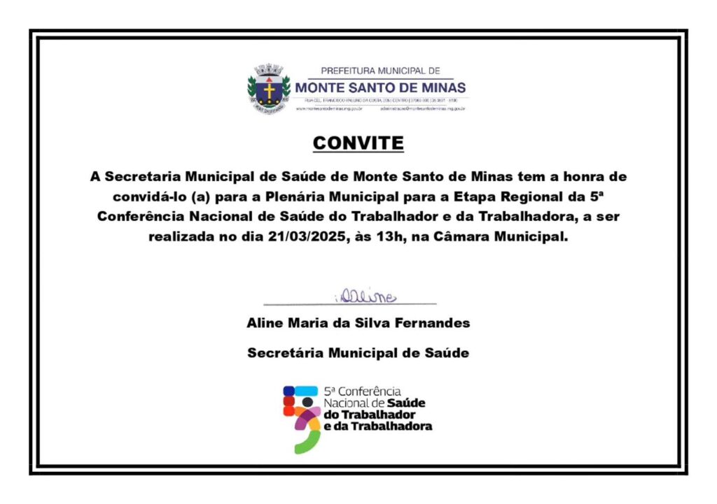 A Secretaria Municipal de Saúde de Monte Santo de Minas convida a população para participar da Plenária Municipal da Etapa Regional da 5ª Conferência Nacional de Saúde do Trabalhador e da Trabalhadora. O evento será realizado no dia 21 de março de 2025, às 13h, na Câmara Municipal.
