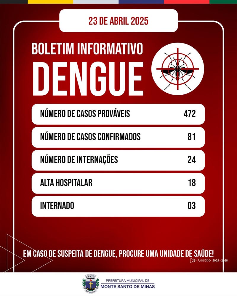 A Secretaria Municipal de Saúde de Monte Santo de Minas atualizou os dados da dengue no município nesta terça-feira, 23 de abril de 2025. Segundo o levantamento, a cidade já contabiliza 472 casos prováveis da doença, dos quais 81 foram confirmados por exames laboratoriais. Atualmente, 3 pessoas seguem internadas, enquanto 24 necessitaram de hospitalização desde o início do ano. Dois óbitos foram confirmados e um ainda está em investigação.