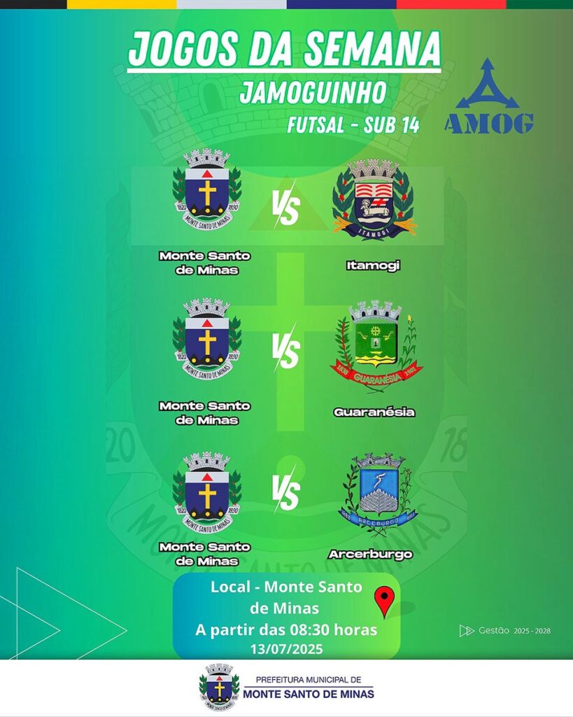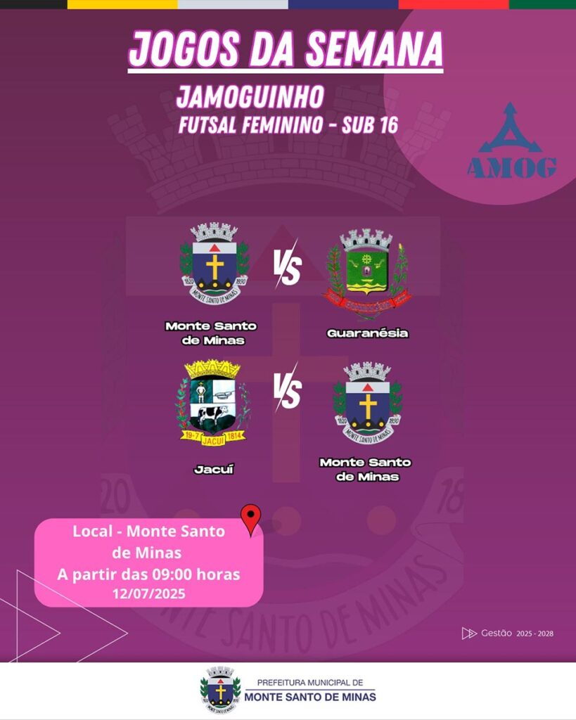Monte Santo de Minas será palco de grandes partidas neste sábado (13) e domingo (14), durante a rodada da Jamoguinho de Futsal Sub-16 feminino e Sub-14 masculino. Os jogos acontecem no Poliesportivo Giovani Tortorelli, a partir das 08h30, com entrada gratuita e torcida garantida.