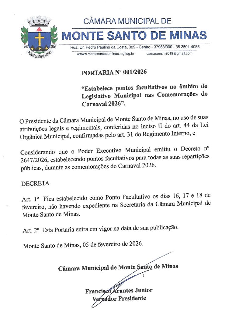 Art. 1º Fica estabelecido como Ponto Facultativo os dias 16, 17 e 18 de fevereiro, não havendo expediente na Secretaria da Câmara Municipal de Monte Santo de Minas.