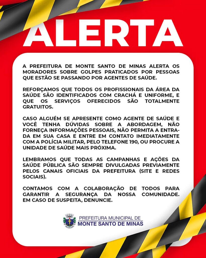 A Prefeitura de Monte Santo de Minas emitiu um alerta à população sobre golpes realizados por indivíduos que se passam por agentes de saúde. De acordo com o comunicado, todos os profissionais da área atuam com crachá de identificação, uniforme e jamais cobram por serviços prestados.