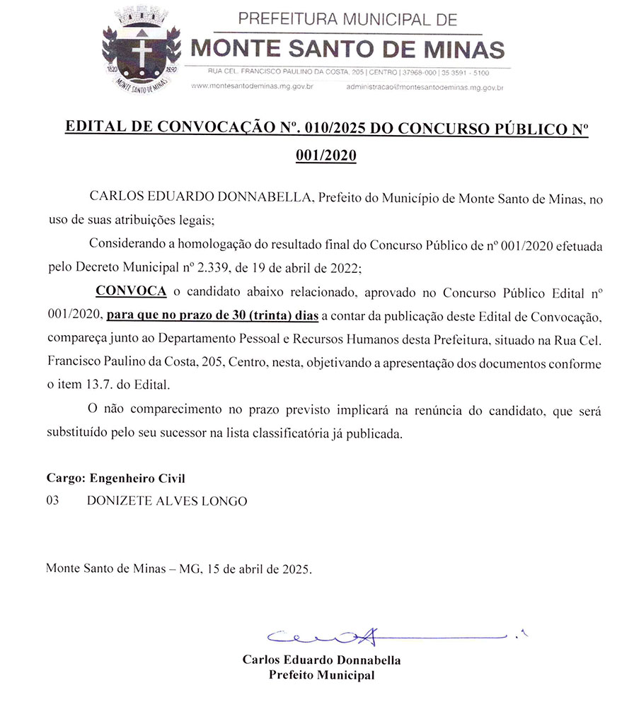 A Prefeitura Municipal de Monte Santo de Minas divulgou nesta terça-feira, 15 de abril, o Edital de Convocação nº 010/2025, referente ao Concurso Público nº 001/2020. O documento, assinado pelo prefeito Carlos Eduardo Donnabella, convoca o candidato Donizete Alves Longo, aprovado para o cargo de Engenheiro Civil, a comparecer ao Departamento Pessoal e Recursos Humanos da Prefeitura no prazo de 30 dias.