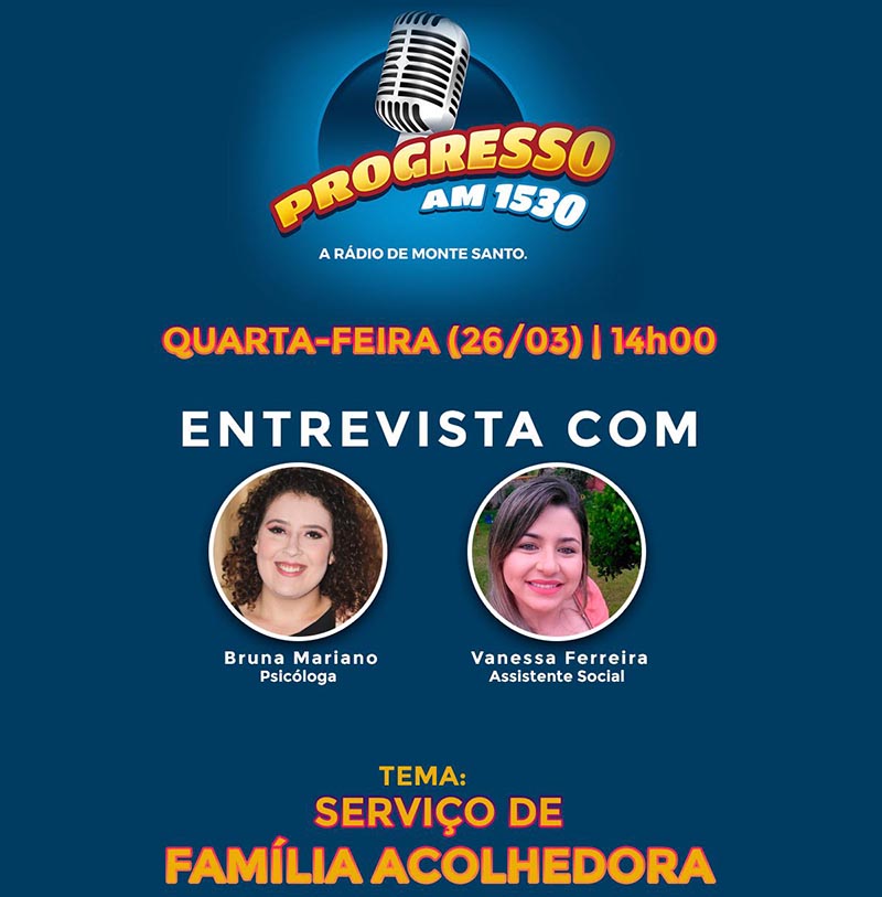 A Prefeitura Municipal de Monte Santo de Minas, por meio da Secretaria de Assistência Social, convida a população para sintonizar na Rádio Progresso AM 1530, nesta quarta-feira, 26 de março de 2025, às 14h.