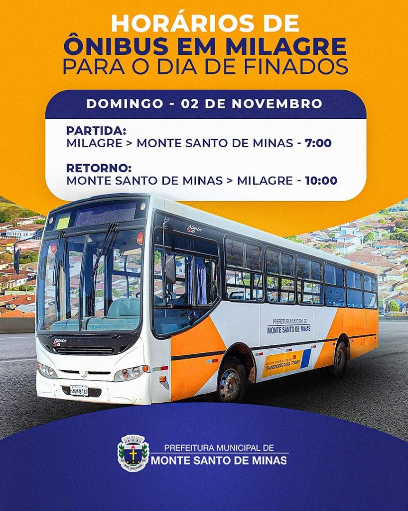O ônibus partirá de Milagre para Monte Santo de Minas às 7h, com retorno às 10h, oferecendo mais comodidade para quem deseja visitar os cemitérios e prestar suas homenagens aos entes queridos.