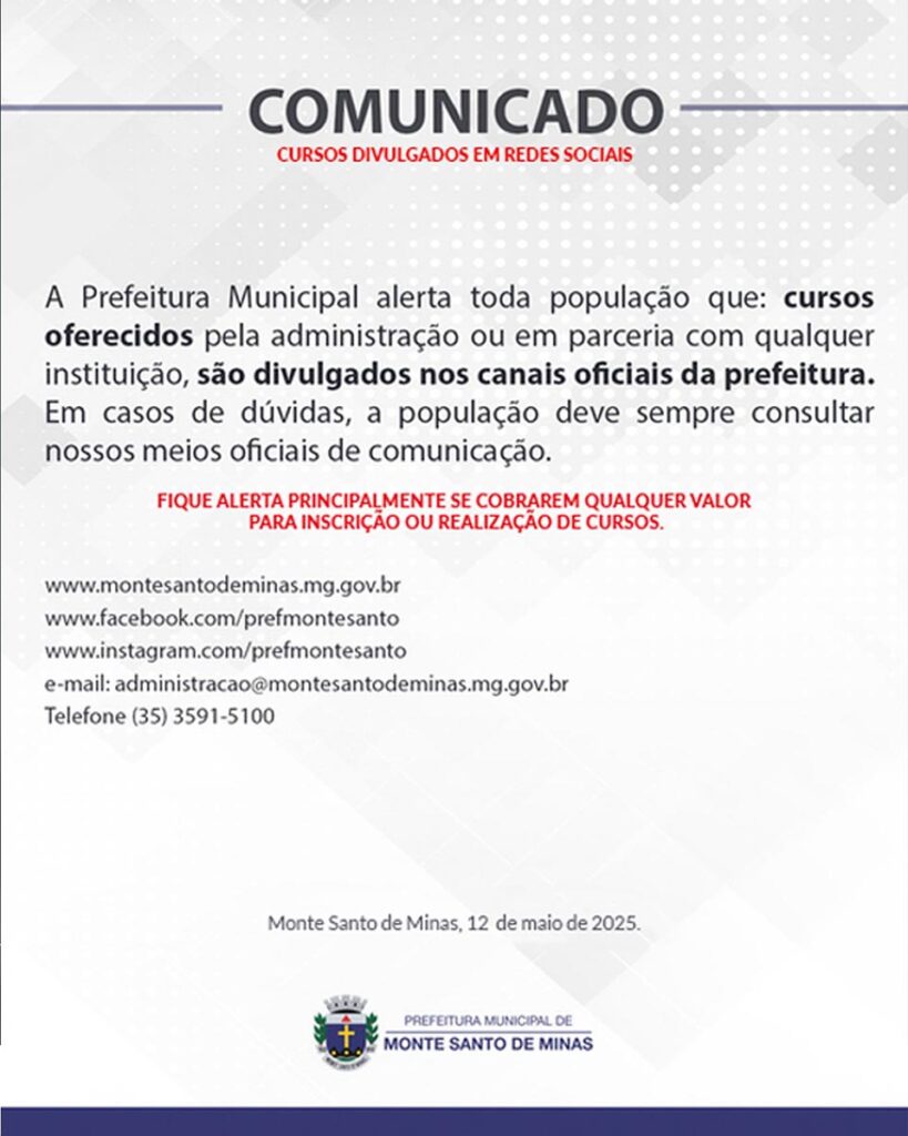 #MonteSantoDeMinas #CursosGratuitos #InformaçãoOficial #PrefeituraMonteSanto #SegurançaDaInformação #ComunicadoOficial #CuidadoComGolpes #TransparênciaPública #CanaisOficiais #JFPNoticias