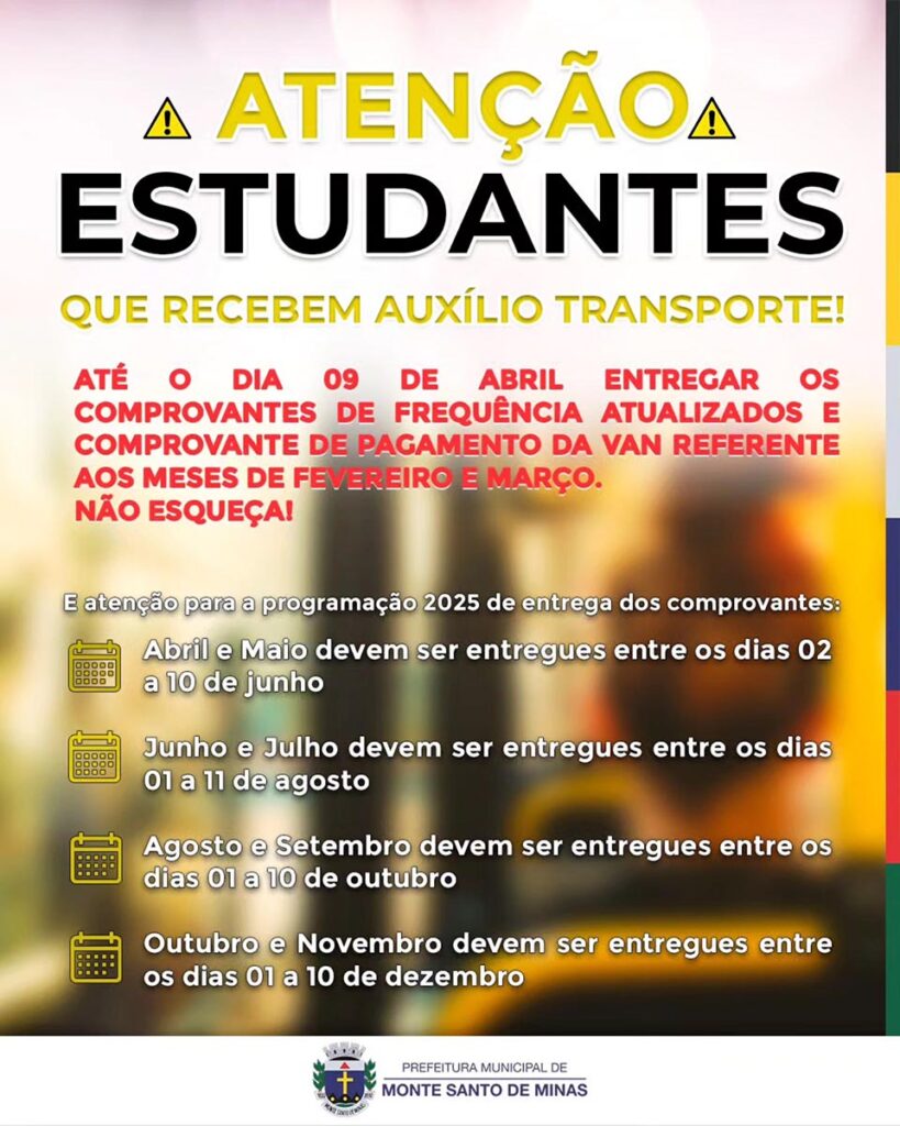 A Prefeitura de Monte Santo de Minas divulgou o prazo para a atualização dos comprovantes do Auxílio Transporte.