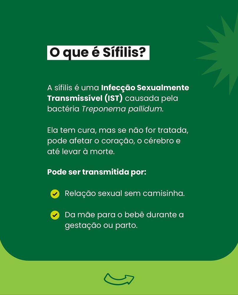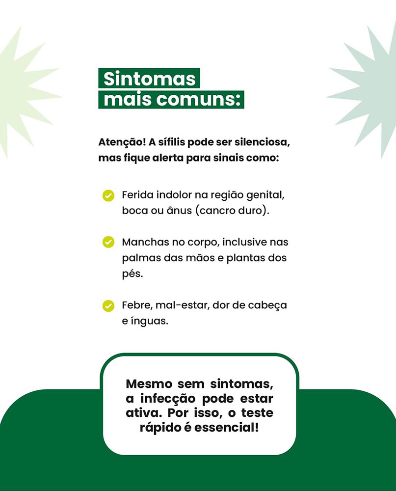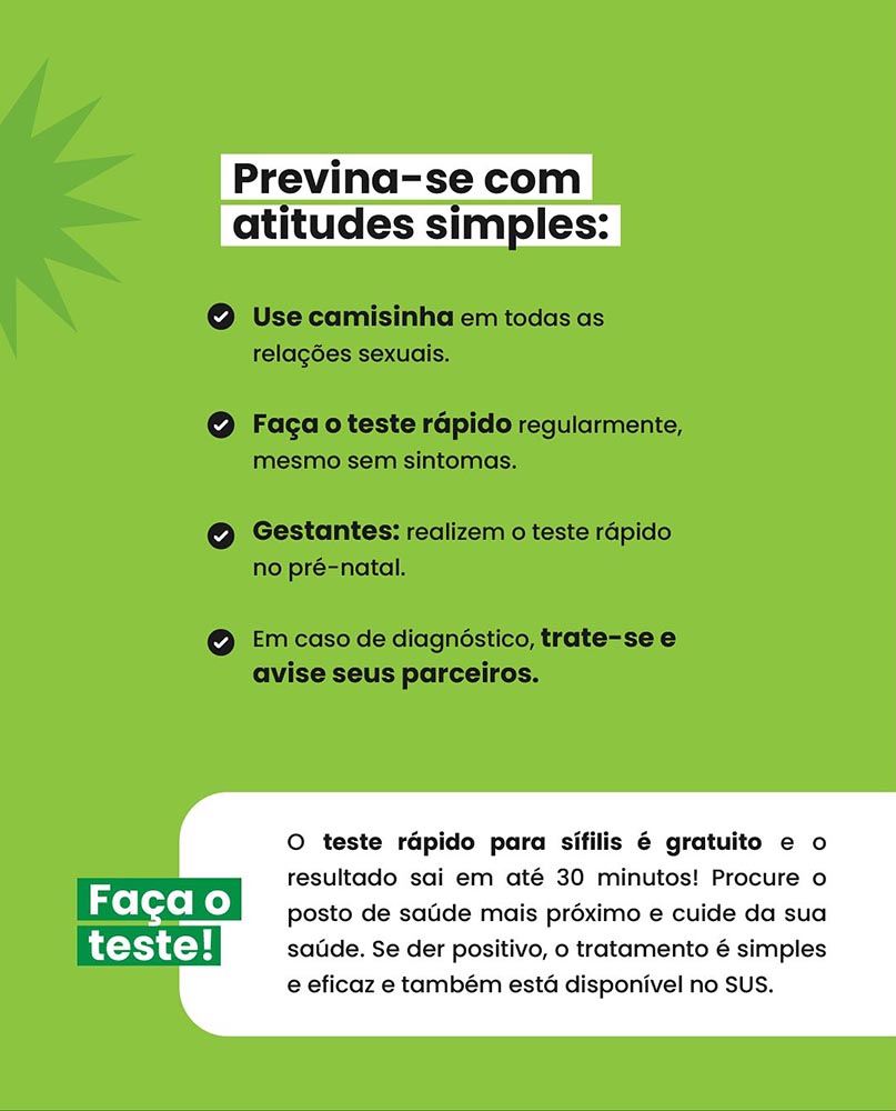 Procure o posto de saúde mais próximo e faça o teste rápido. Detectar a sífilis a tempo é o primeiro passo para interromper a transmissão e garantir qualidade de vida.