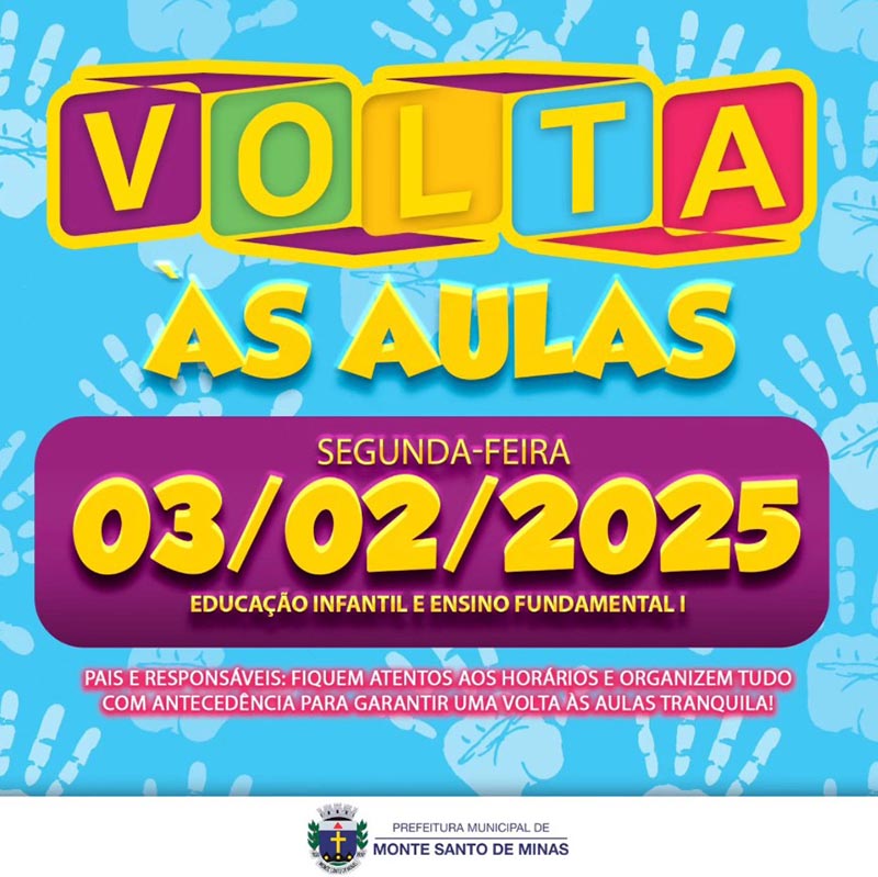 A Prefeitura de Monte Santo de Minas anunciou o retorno das aulas da Educação Infantil e do Ensino Fundamental I da Rede Municipal de Educação para a próxima segunda-feira, 03 de fevereiro. As escolas estão se preparando com cuidado e dedicação para receber os alunos, com o objetivo de proporcionar um ano letivo repleto de aprendizado, descobertas e novas conquistas.