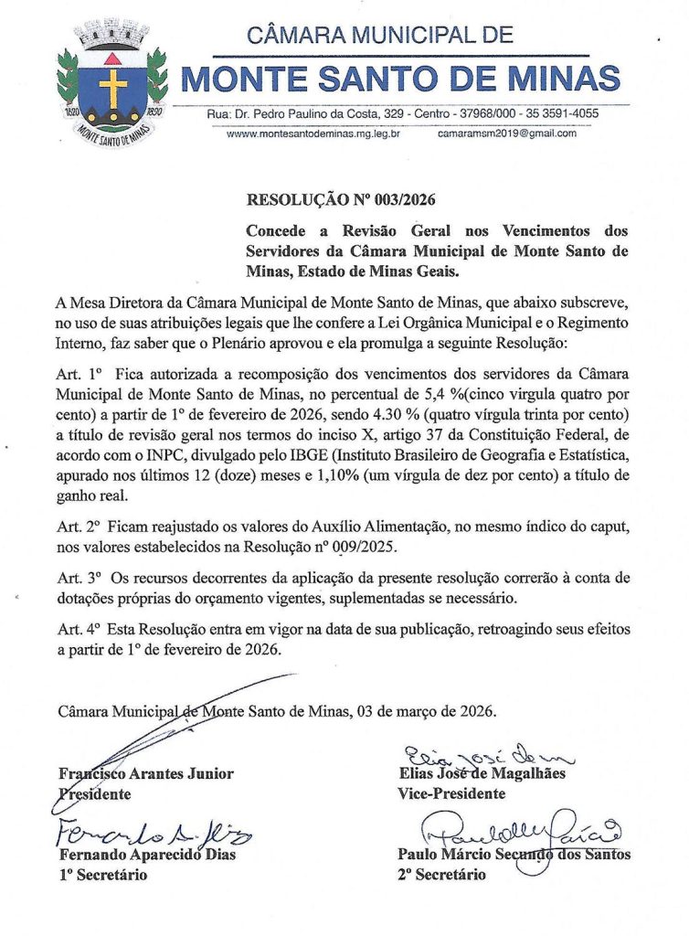 DestaquesDestaques Monte Santo de MinasMinas GeraisMonte Santo de MinasResolução RESOLUÇÃO Nº 003/2026 Concede a Revisão Geral nos Vencimentos dos Servidores da Câmara Municipal de Monte Santo de Minas, Estado de Minas Gerais Por @jfpnoticias - 5 de março de 2026 2 0 COMPARTILHAR Facebook Twitter Concede a Revisão Geral nos Vencimentos dos Servidores da Câmara Municipal de Monte Santo de Minas, Estado de Minas Gerais