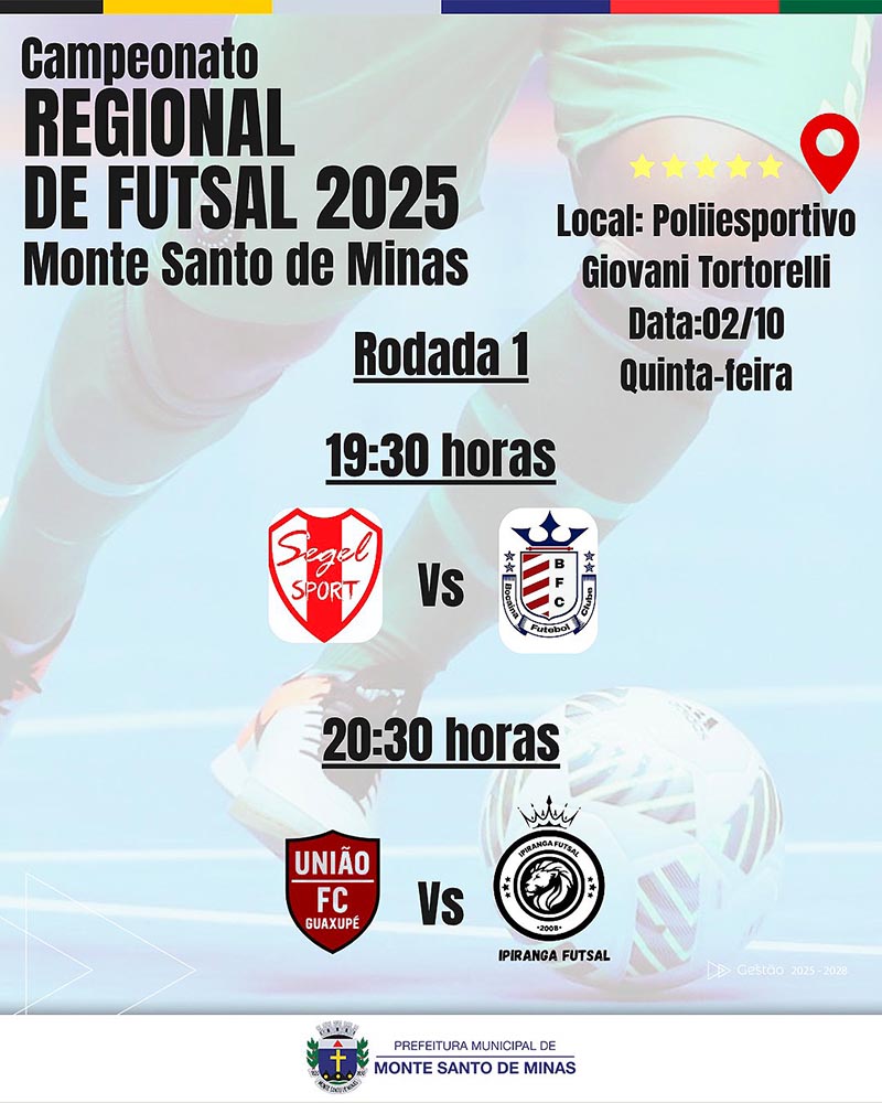 A emoção do futsal continua em Monte Santo de Minas com a segunda rodada do Campeonato Regional, que acontece nesta quinta-feira, 2 de outubro, no Poliesportivo Giovani Tortorelli.