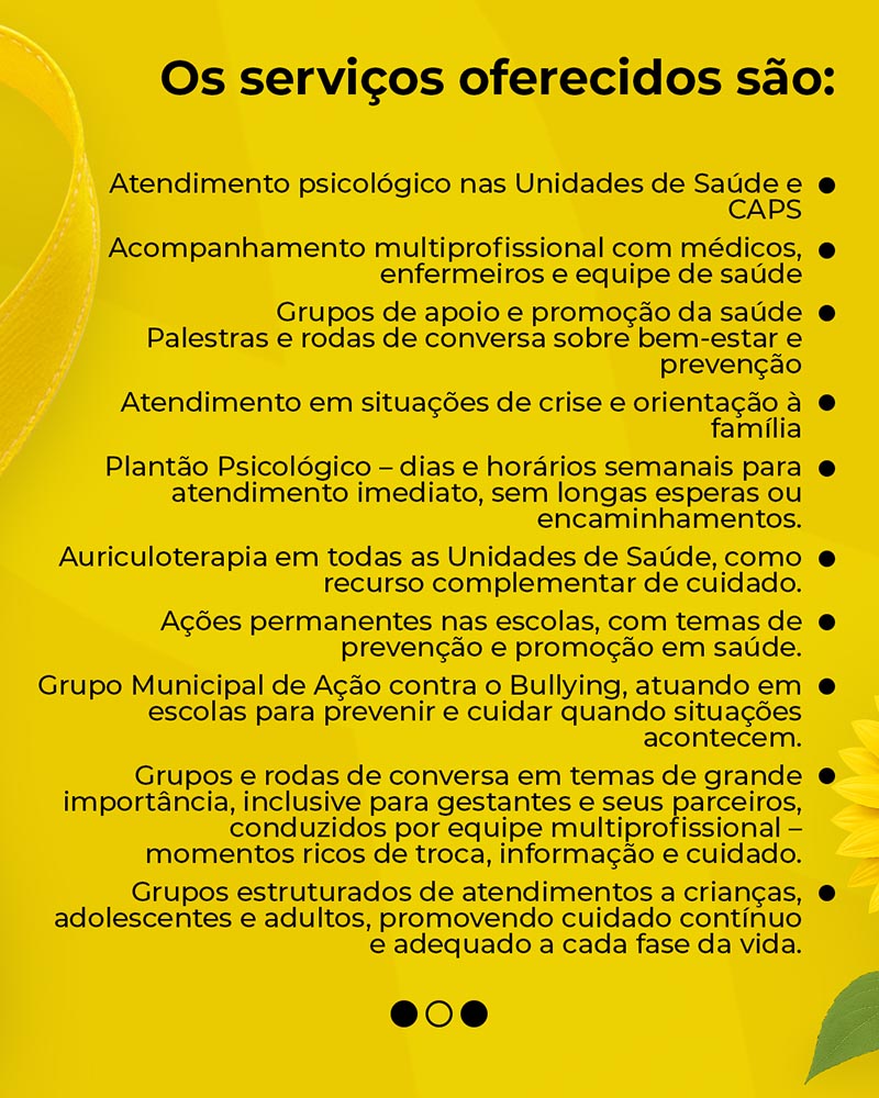 A Prefeitura destaca ainda programas como o tratamento estruturado para quem deseja parar de fumar, palestras sobre bem-estar e atendimento especializado em situações de crise.