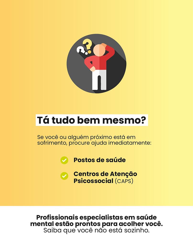 Quem estiver passando por dificuldades pode procurar a unidade de saúde mais próxima para receber apoio adequado.