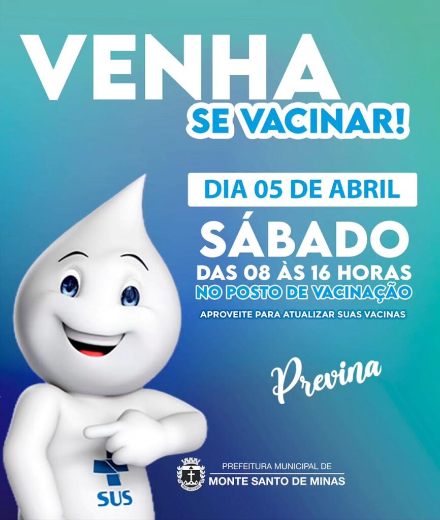 A Prefeitura de Monte Santo de Minas, por meio da Secretaria Municipal de Saúde, realiza neste sábado, 5 de abril, um dia especial de vacinação. A ação acontece no posto de saúde, das 8h às 16h, e tem como objetivo facilitar o acesso da população às vacinas e garantir a atualização da caderneta vacinal.