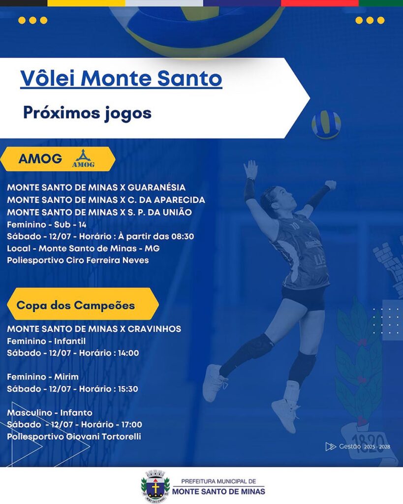 Monte Santo de Minas será palco de uma verdadeira maratona esportiva neste sábado, 12 de julho, com jogos decisivos de vôlei pelas competições Amog e Copa dos Campeões. A cidade receberá atletas de diferentes faixas etárias e municípios, consolidando-se como referência regional na formação de novos talentos do esporte.